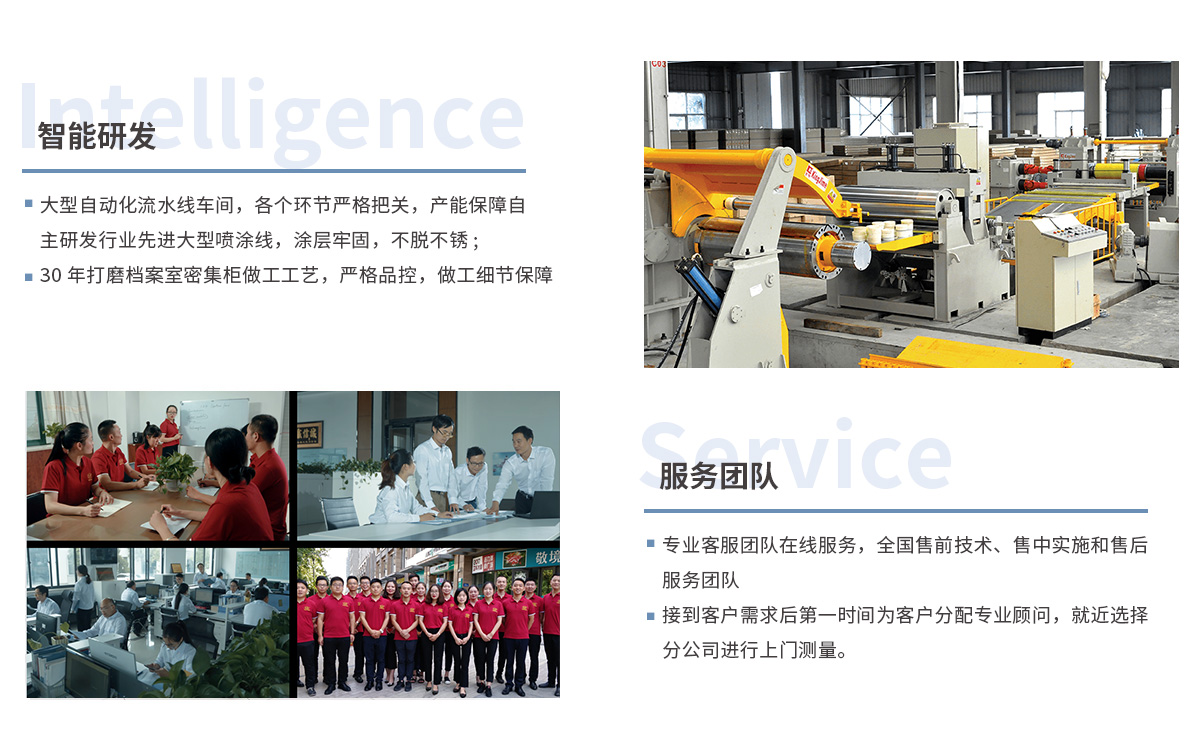 大型自動化流水線車間,各個環節嚴格把關,產能保障 自主研發行業先進大型噴涂線,涂層牢固,不脫不銹; 花都27年打磨檔案室密集柜做工工藝,嚴格品控,做工細節保障
