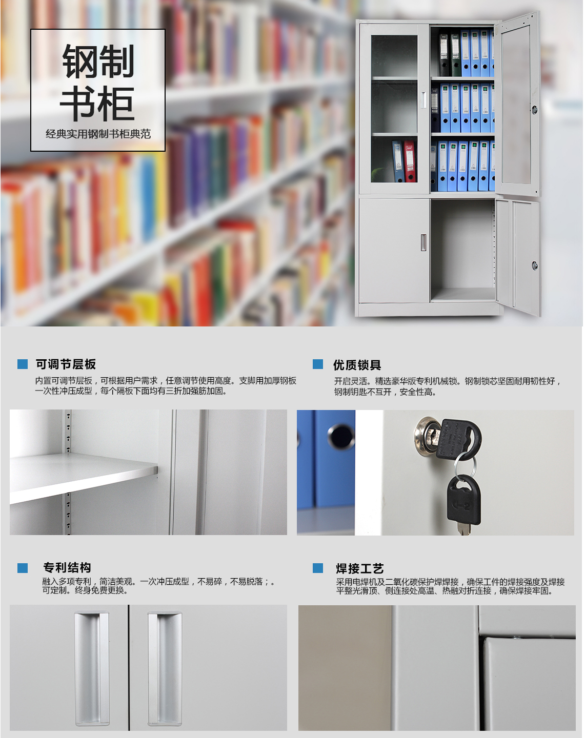 鋼制書柜經典實用鋼制書柜典范可調節層扳內置可讕節層板,可根據用戶需求,任意節使用高度。支腳加厚鋼板一次性沖壓成型,麗個隔板下面均有三折加強箭加固。專利結構斜入多項專利,簡潔美一次沖壓成型,不易碎,不易脫落,可定制。終身免更換。優質鎖具開靈活。精選豪華版專利機械鎖。鋼制鎖芯堅固耐韌性好,鋼制鑰匙不互開,安全性高。焊接工藝采用電埠機及二氧化碳保護悍接,確保工件的焊接強度及接平整光滑頂、側連接處高溫、熱對扌斤連接,確保接牢固。