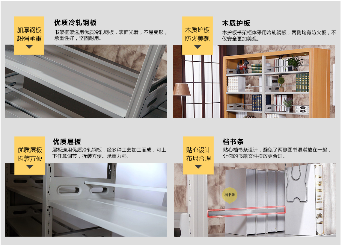加厚鋼板超強承重優質層板拆裝方便優質冷軋鋼板書架框架選優質冷軋鋼板,表面光滑,不易變形,承0性好,堅固的用。優質層板層板選甲優質冷軋謳板,經多種工藝加工而成,可上下任意調節,拆裝方便。承重力強。木質護板防火美觀貼心設計布局合理木質護板木護板書架柜體采用冷軋鋼板,兩側均有防火板,不僅賓全更加萋觀。檔書條貼心檔書條設計,擗免了兩側圖書混淆放在一起,讓你的書箱文件擺放更合理。檔書條