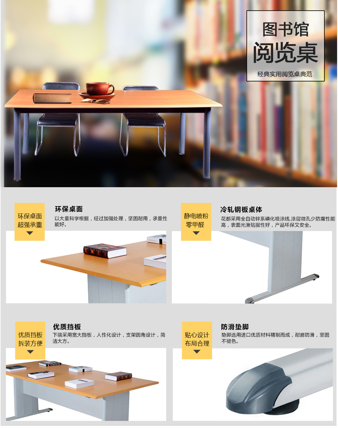 圖書館閱覽桌經典實用兌覽桌典范0環保卓面超強承重優質擋板拆裝方便環保桌面以大量科學根據,經過加強處理,堅固耐,承重性能好。優質擋板下端采賁大扌當板,人性化設計,支架圓角設計,簡潔大方。靜電噴粉零甲醛貼心設計布局合理過0冷軋鋼板桌體花都采用全自動鋅系磷化嘖涂線,涂層微孔少防腐性能高,表面光滑貼服性好,產品環保又賓全。防滑墊腳墊腳選進口優質材料精制而成,耐磨防滑,堅固不色